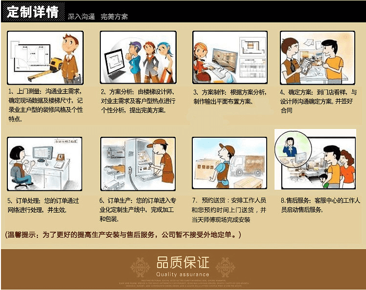 7. 产品生产完毕后,我们将跟您约定上门安装 时间,专业物流货运配送,专业人员进场安 装,客户现场验收。尊享产品售后服务。